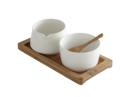 Ceramic milk jug and sugar bowl. A sleek design combining bamboo and ceramics