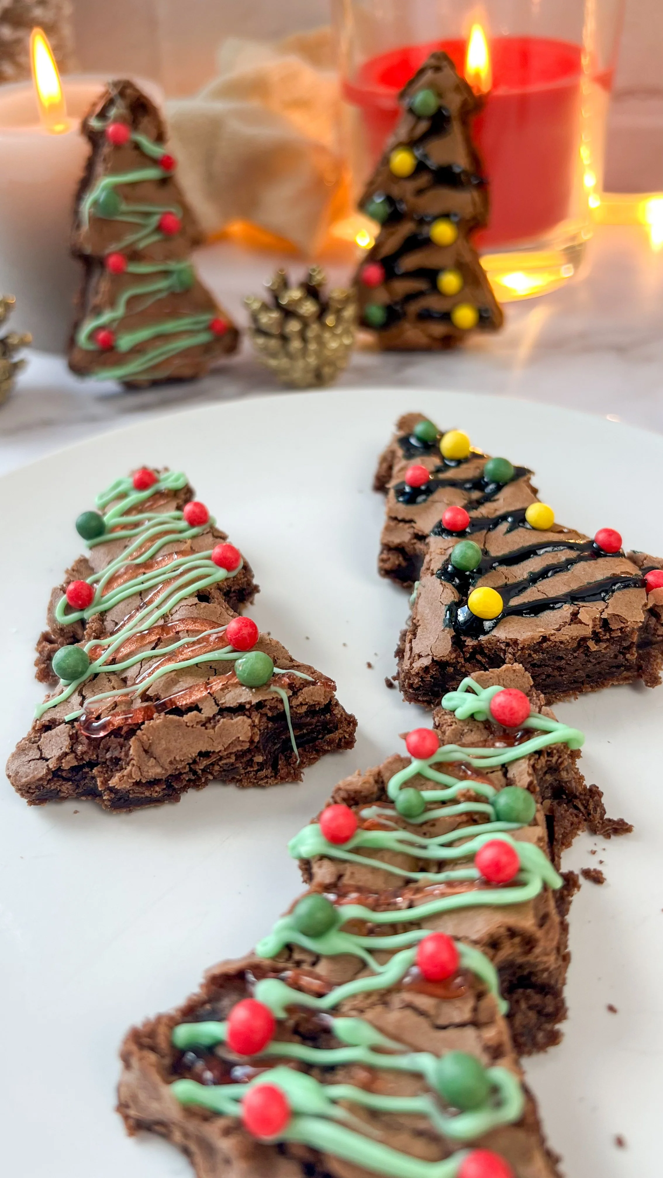 If you don't have time to bake, the easiest way to whip up delicious and beautiful Christmas cookies is to grab a prebaked gluten-free brownie or a gluten-free brownie mix. Cut little trees with cookie cutters from the brownie, and then get creative with decorating! Add your favorite toppings to make them look like adorable Christmas trees.