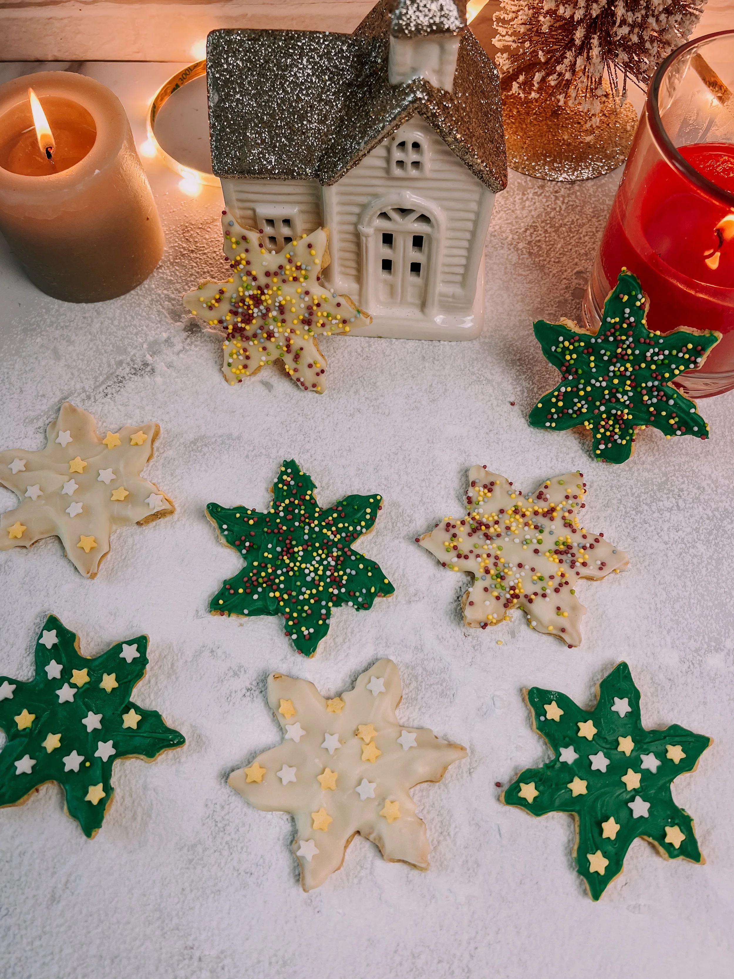 - Roll out the chilled dough on a floured surface and cut out Christmas shapes using star cookie cutters.