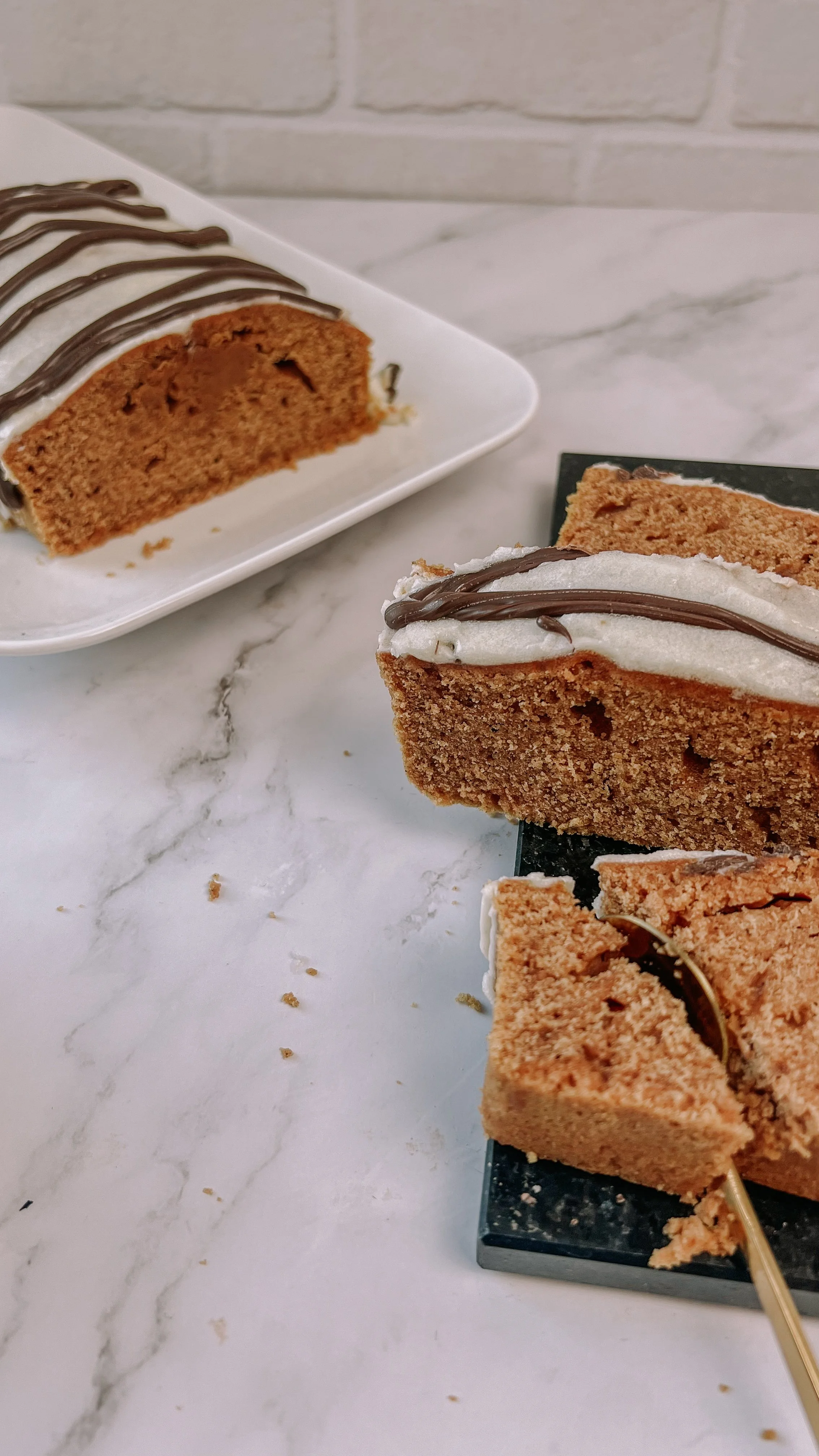 - Top your cake with frostin of your chouce: we used icing powder and mixed it with lemon to create a glaze and then, once the icing has dried, topped it with melted dark chocolate