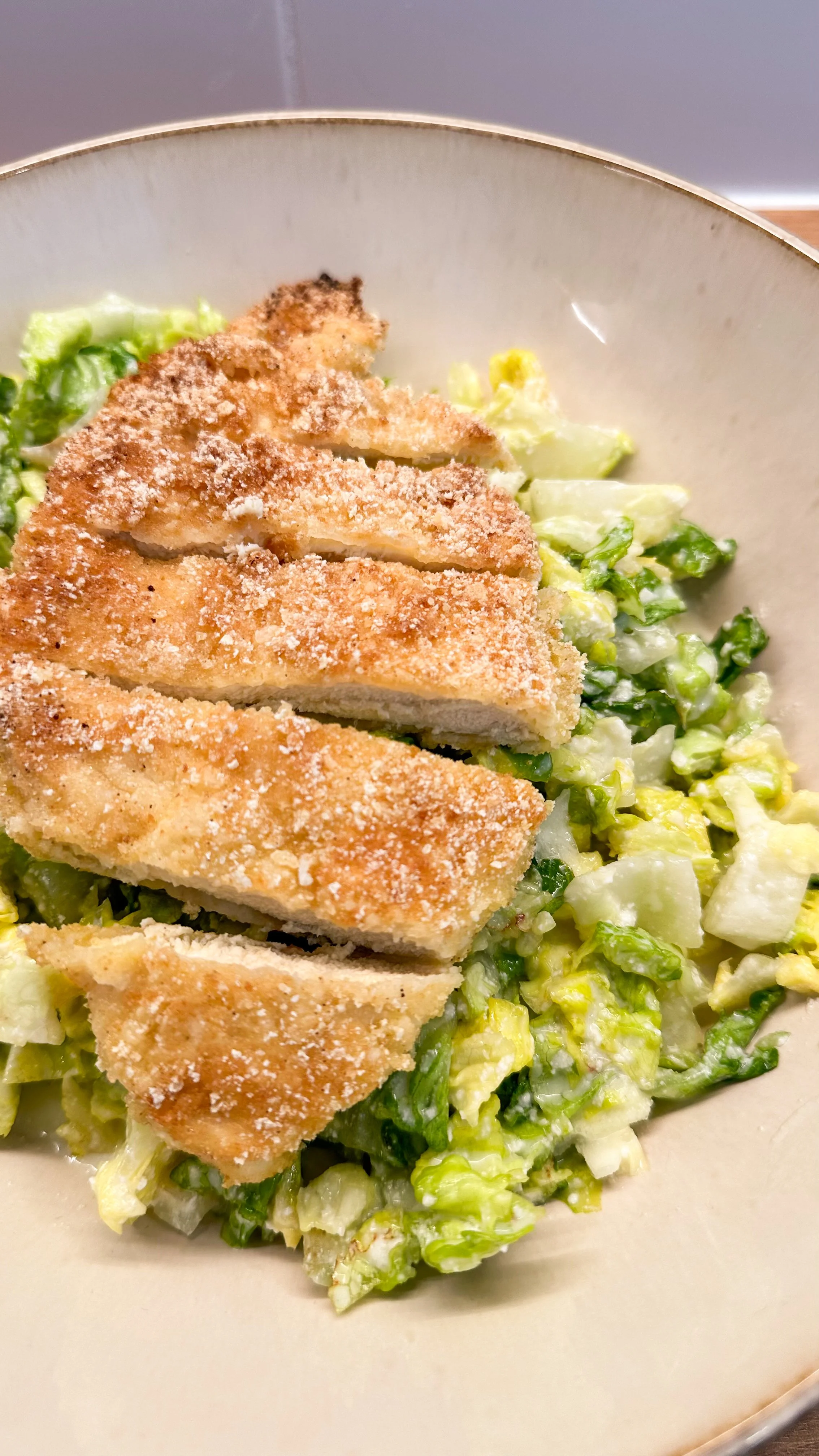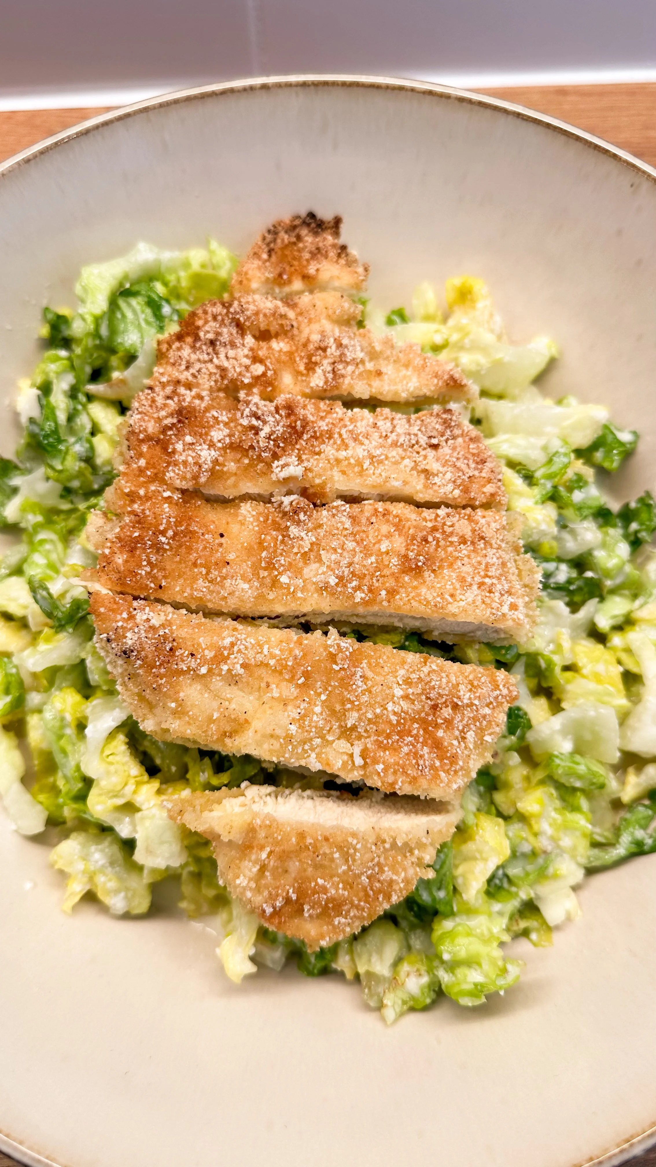 - Top each schnitzel with a generous portion of the Caesar salad.