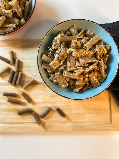 To create a perfect, creamy, dairy free pasta skillet, you don’t need much. To replace the whipped cream, I use soya cream. It has no taste of its own, contains less calories and fats than normal whipped cream and will definitely not cause inflammations in your body. It’s the perfect replacement if you miss dairy sometimes, as I do.