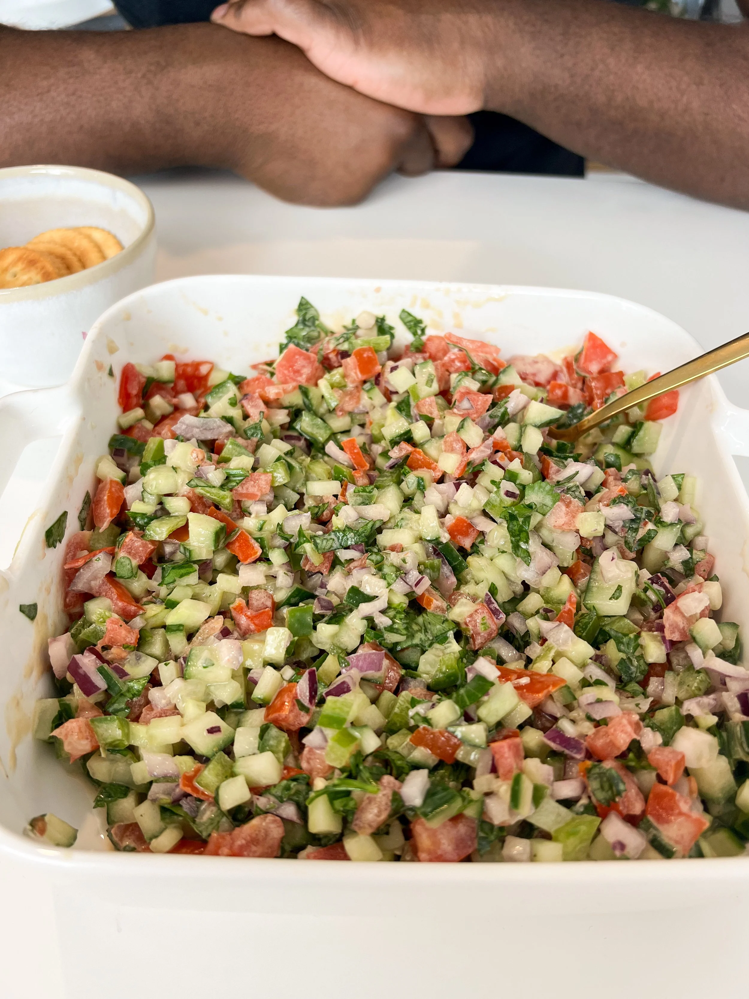 Picture this: crisp cucumbers, juicy tomatoes, and vibrant herbs, all tossed together in a luscious tahini dressing. It's a symphony of flavors that dance on your palate, refreshing and satisfying at the same time.